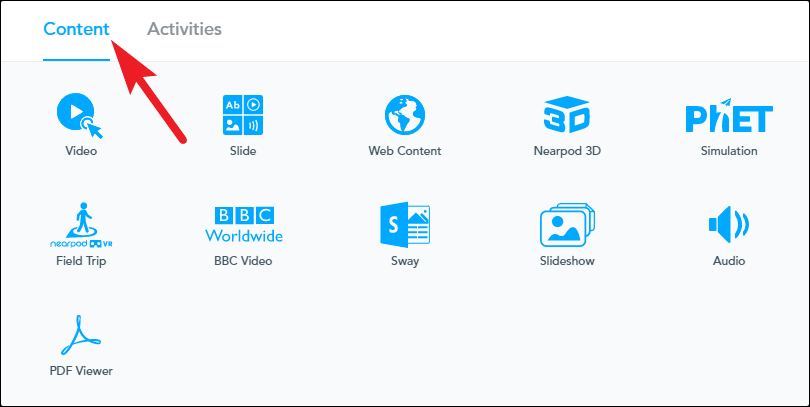 If you want to add a non-interactive content type, you can select it from the content tab. Nearpod lets you choose from these content types: Slide, Video, Web content, Nearpod 3D, Simulation, Field Trip (Nearpod VR), BBC video, Microsoft Sway, Slideshow, Audio, PDF viewer, and Live Twitter stream.