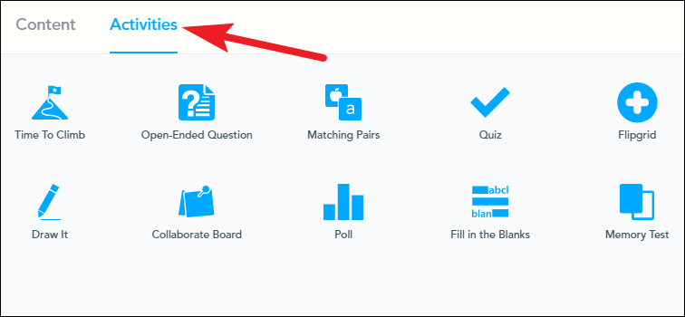 For interactive content that lets students participate in the lesson, go to the ‘Activity’ tab and choose one of the following activities: Time to Climb, Open-Ended Question, Matching Pairs, Quiz, Flipgrid, Draw It, Collaborate!, Poll, Fill in the Blanks, Memory Test.