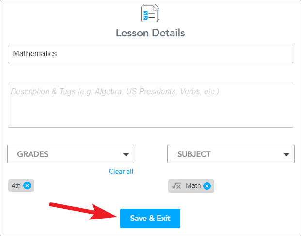 A small window will open. Enter a title, and description (optional), and specify the grade and subject the lesson is for and click on the ‘Save & Exit’ button.