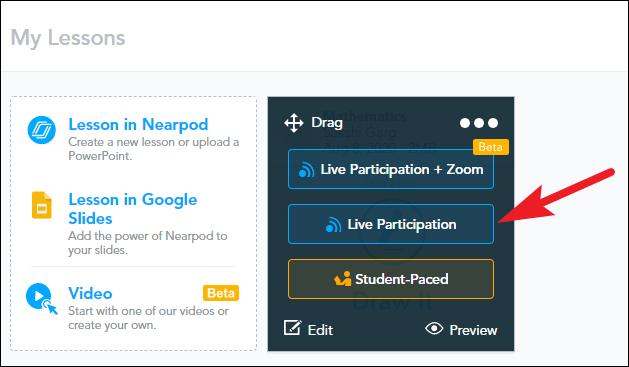To share the lesson so students can participate in real-time, click on the ‘Live Participation’ option.