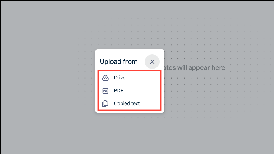 - Then, select what you want to upload. Options include Drive (Google Docs), PDF (from your computer), and copied text. Click on the desired type and upload the documents; you can also upload multiple sources in one go.