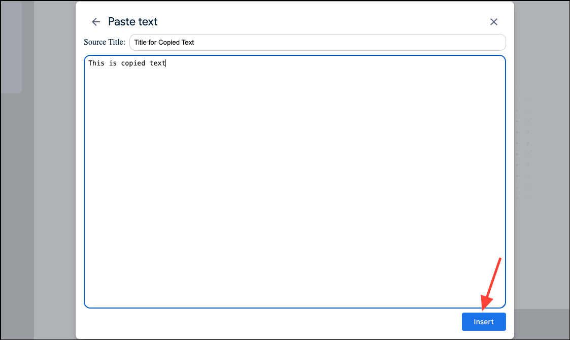 - For copied text, you can only copy-paste one source at a time. Paste your text in the textbox. Then, enter a title for the source (you cannot create a source from copied text without providing a title) and click on 'Insert'.