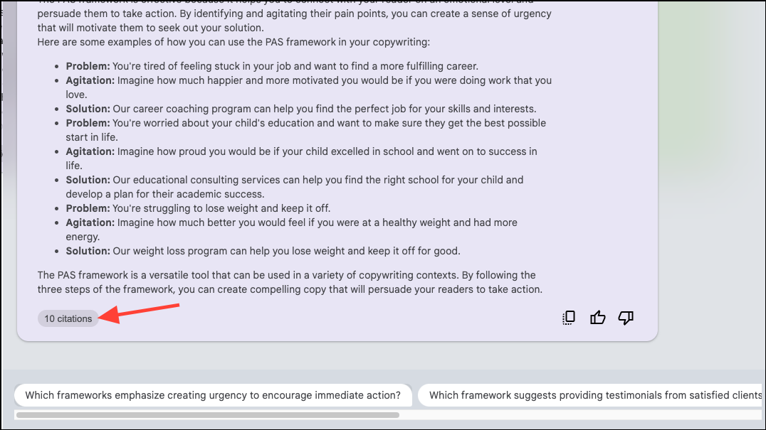 - You'll get an answer from the chatbot, along with citations from the sources that it based the answer on.