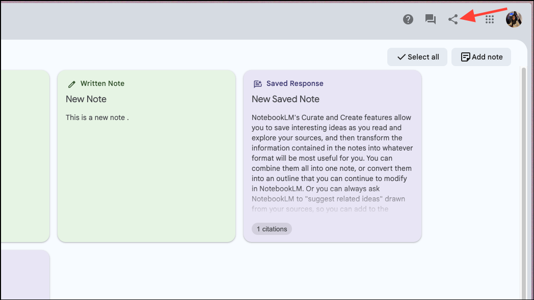You can also save any interesting exchanges with NotebookLM or quotes/ excerpts from your source materials as notes. When you save an exchange with NotebookLM as a note, it is saved with citations.