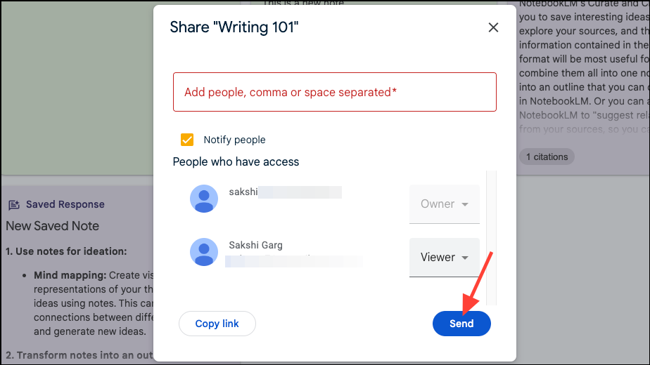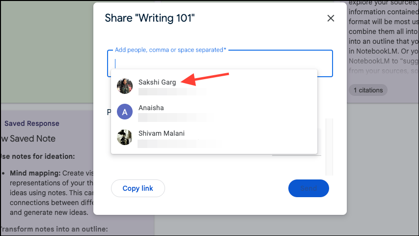 - Then, enter the email addresses of the users you want to share the notebook with or select people from suggestions. You can only share a notebook with users in the same domain as yours, such as @gmail.com, @abc.edu, etc.