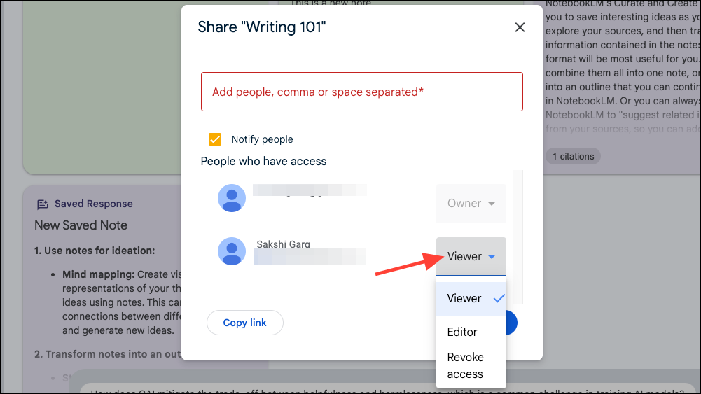 - You can select the permission (Viewer/ Editor) for each user from the drop-down next to their username.