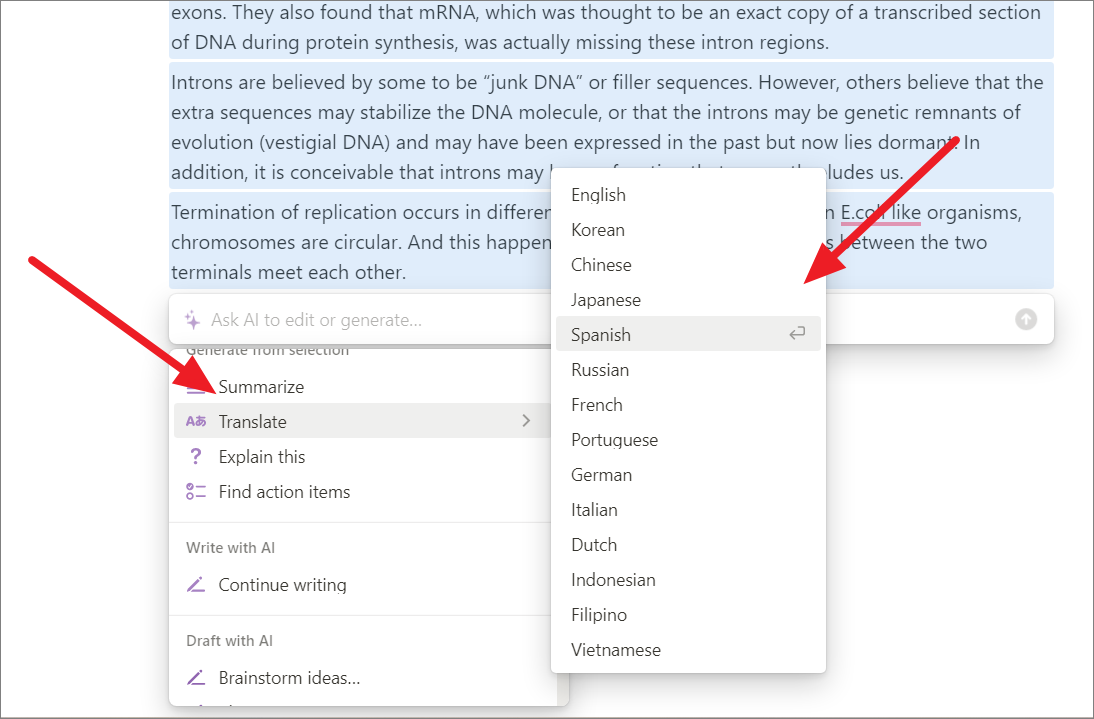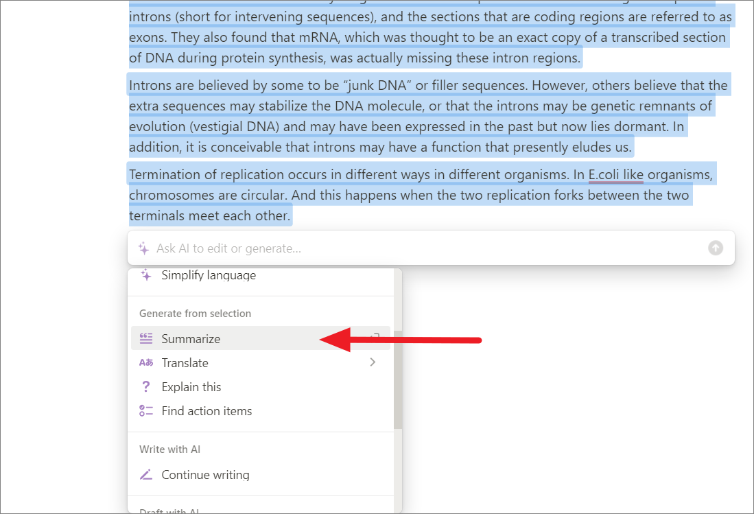 Then, choose what you want AI to do with the selected text. Here, we are selecting ‘Summarize’ under the ‘Generate from selection’ section.