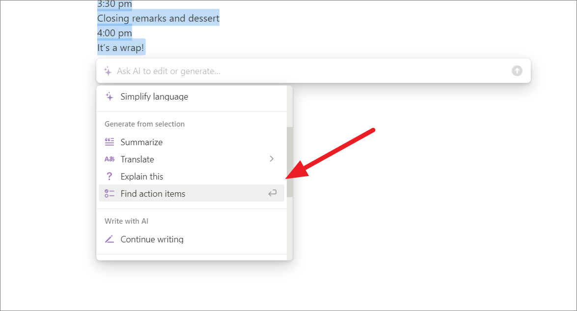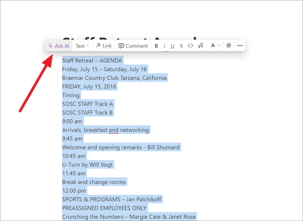 To do that, copy the entire or part of the agenda and paste it into the Notion page. Then, select the content and click ‘Ask AI’.