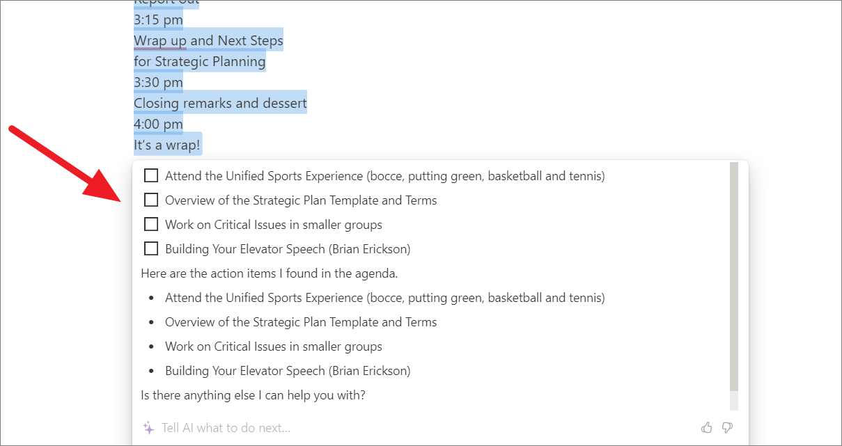 For example, let’s say we wanted to find the action items in this staff retreat agenda.