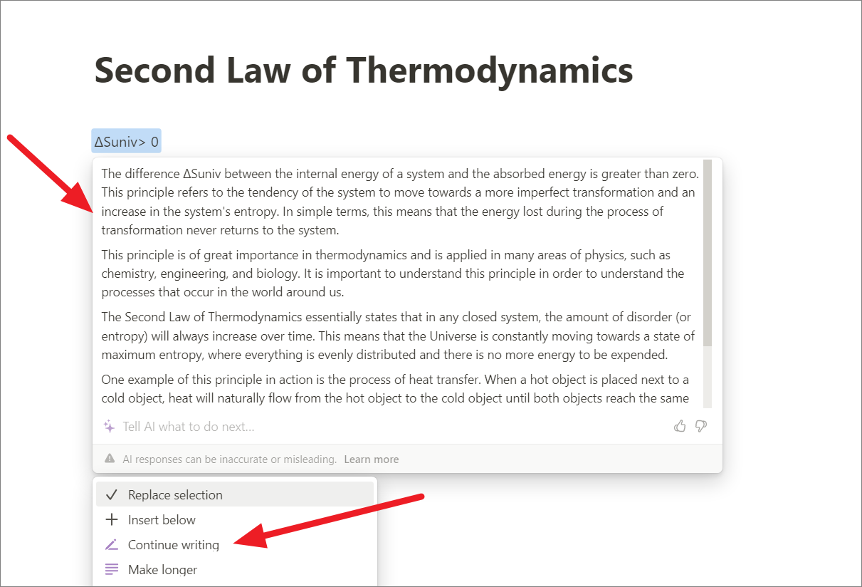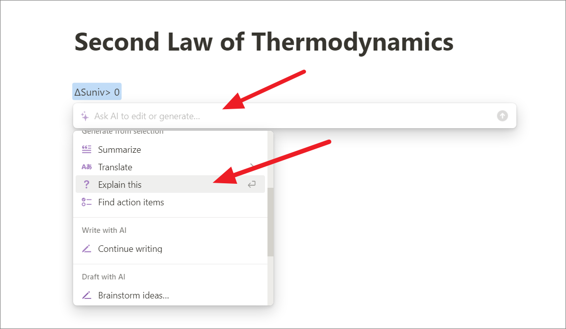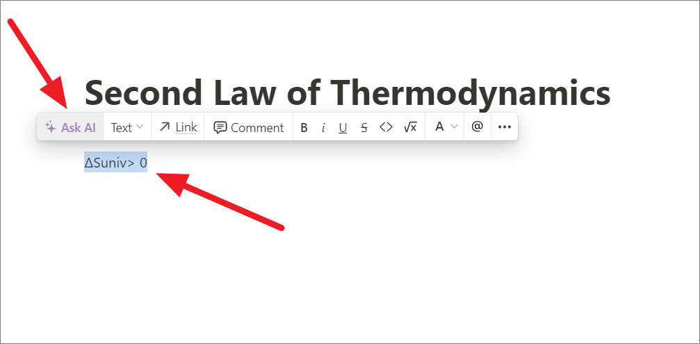 For example, let us see if the Notion AI can understand complex physics equations and explain them to us. Here, we entered the equation for “The second law of thermodynamics” in a Notion page: ΔSuniv> 0. Select the text you want an explanation for and click ‘Ask AI’ to get an explanation. Or you can press Space to type in the Notion AI bar to explain anything to you.