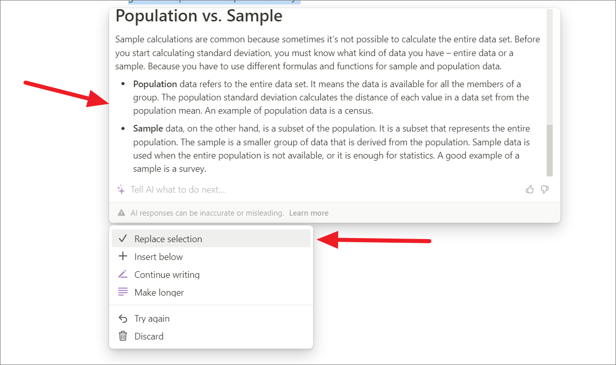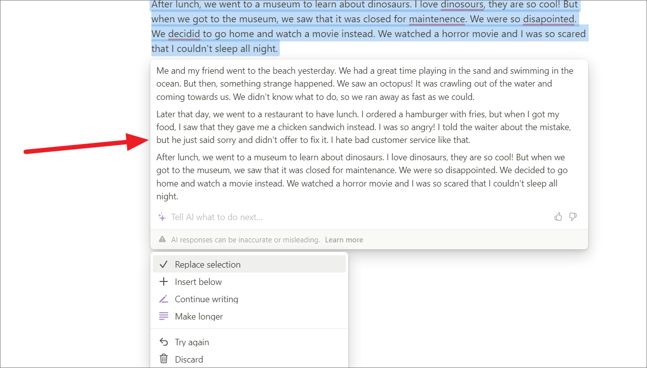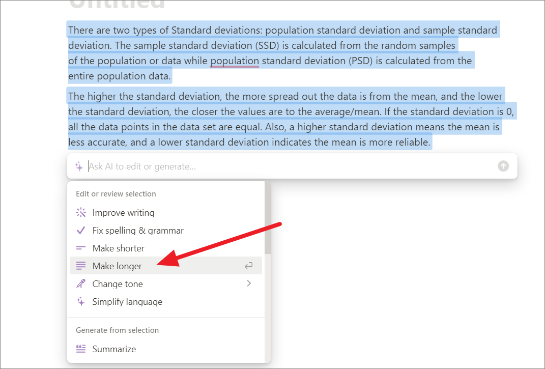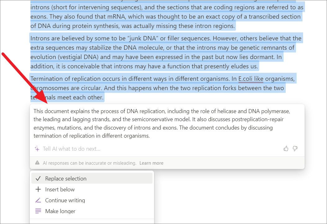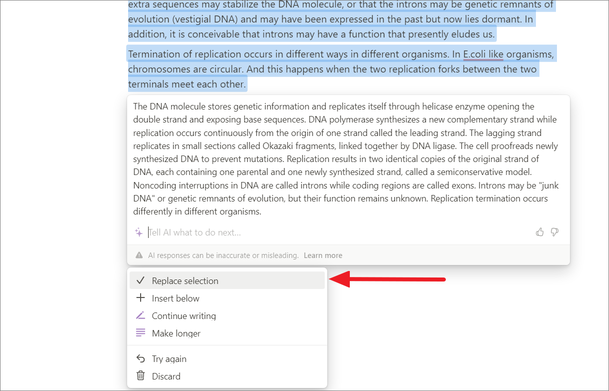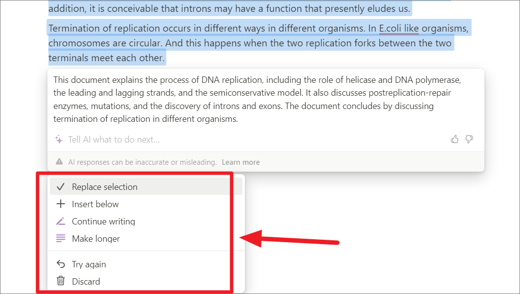 To replace your content with text returned by the AI, choose the ‘Replace selection’ option from the below menu. Similarly, you can use the ‘Make longer’ option to expand your content.