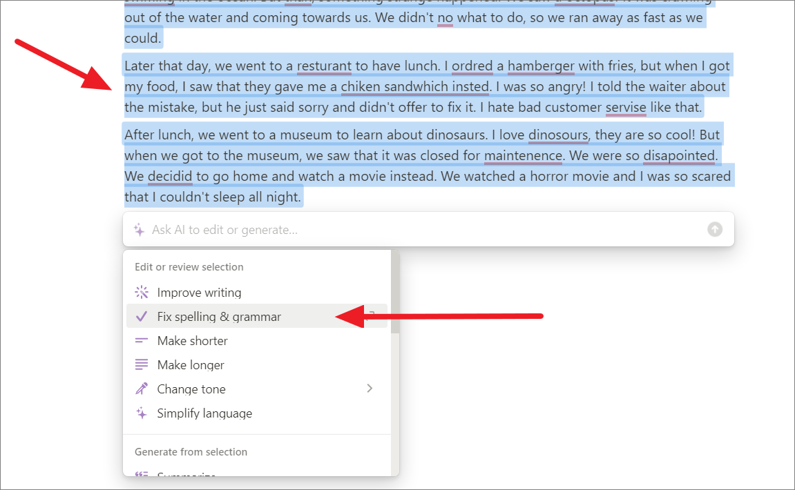 - Fix spelling and grammar – Notion AI’s built-in spell check and grammar correction feature scans your written content for errors such as misspelled words and incorrect grammar.