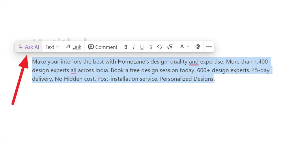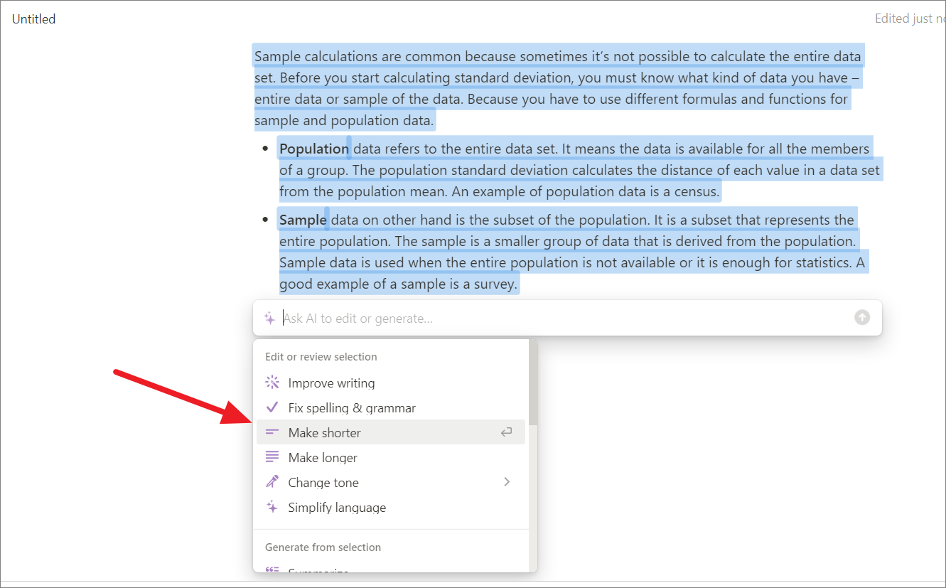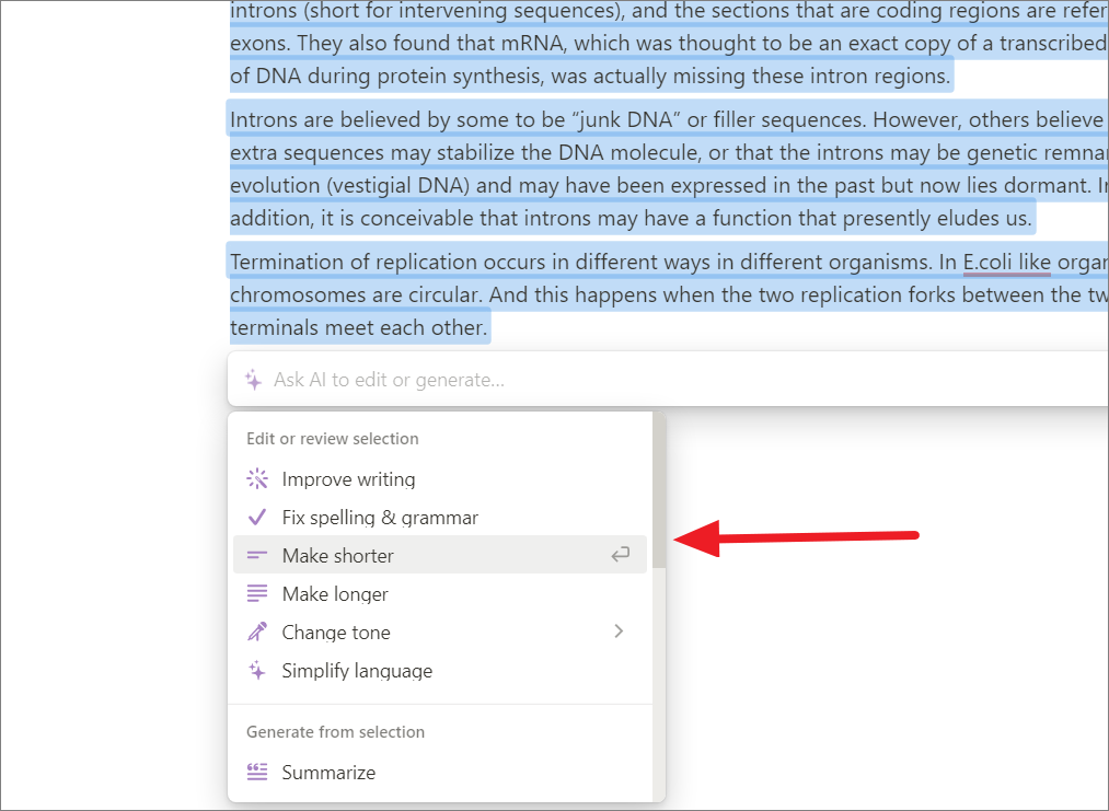 To shorten the written content, select the text, select ‘Ask AI’, and then choose the ‘Make shorter’ option.