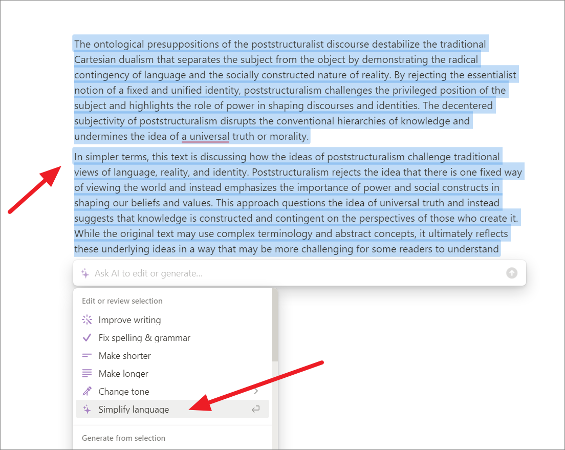 In the below example, we are going to simplify a sample text that might be challenging to understand using the ‘Simplify language’ option in the AI menu.