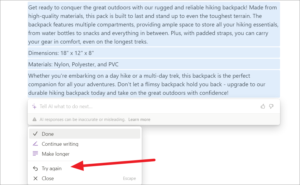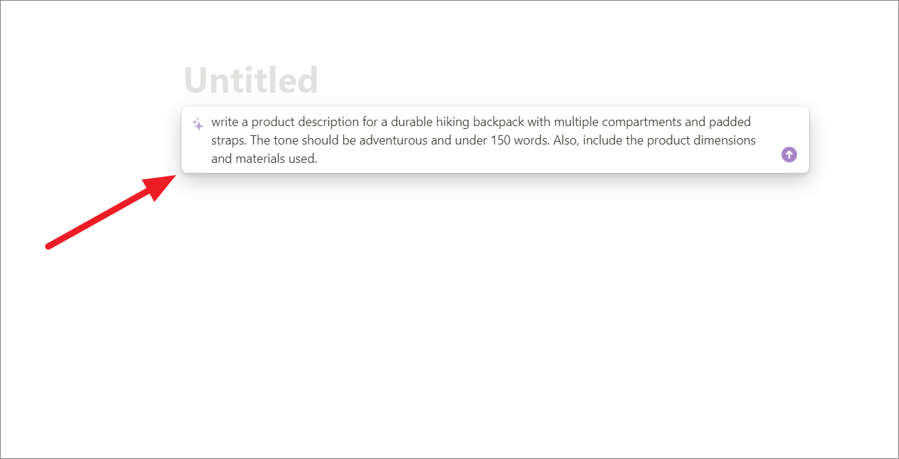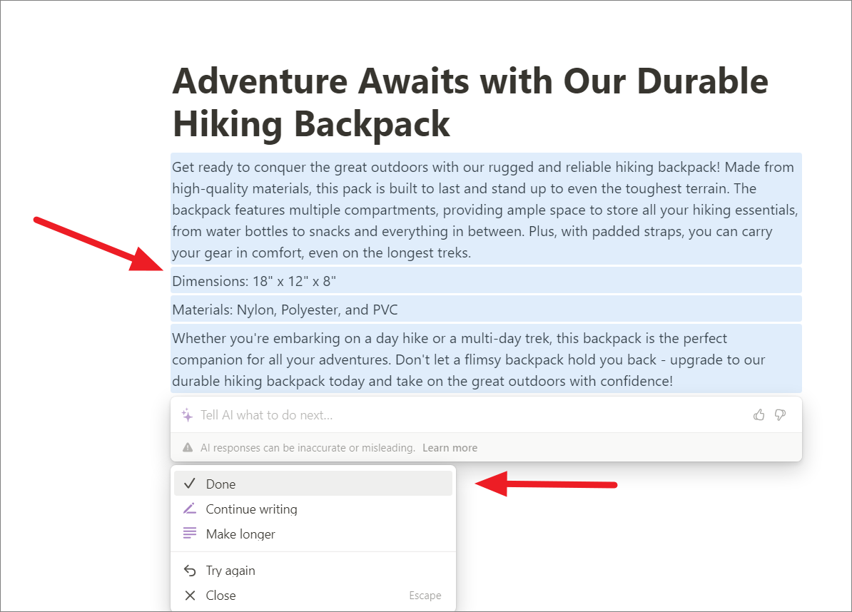 Example 1: Instead of asking Notion AI to “write a product description for a backpack,” a more effective prompt could be “write a product description for a durable hiking backpack with multiple compartments and padded straps. The tone should be adventurous and under 150 words. Also, include the product dimensions and materials used.”