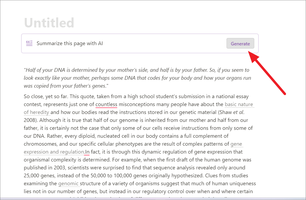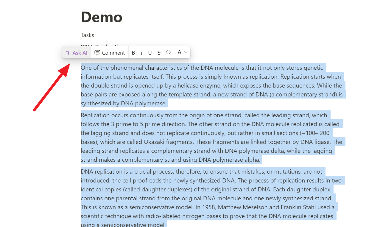 Let’s assume we are writing a science research paper on DNA Replication and we want to use Notion AI to edit and review the paper. For this example, I entered the text from “21st Century Anthropology: A Reference Handbook” which is visible in the screenshot below. To summarize the written content, select the text and click the ‘Ask AI’ button in the floating panel.