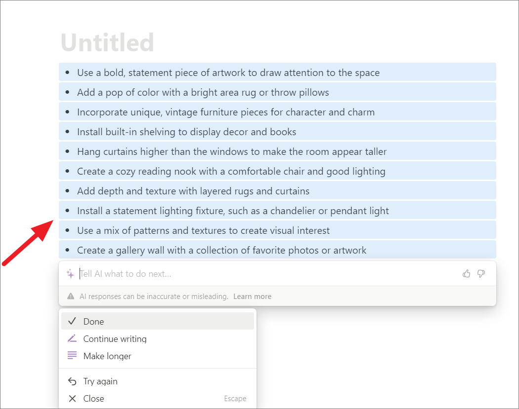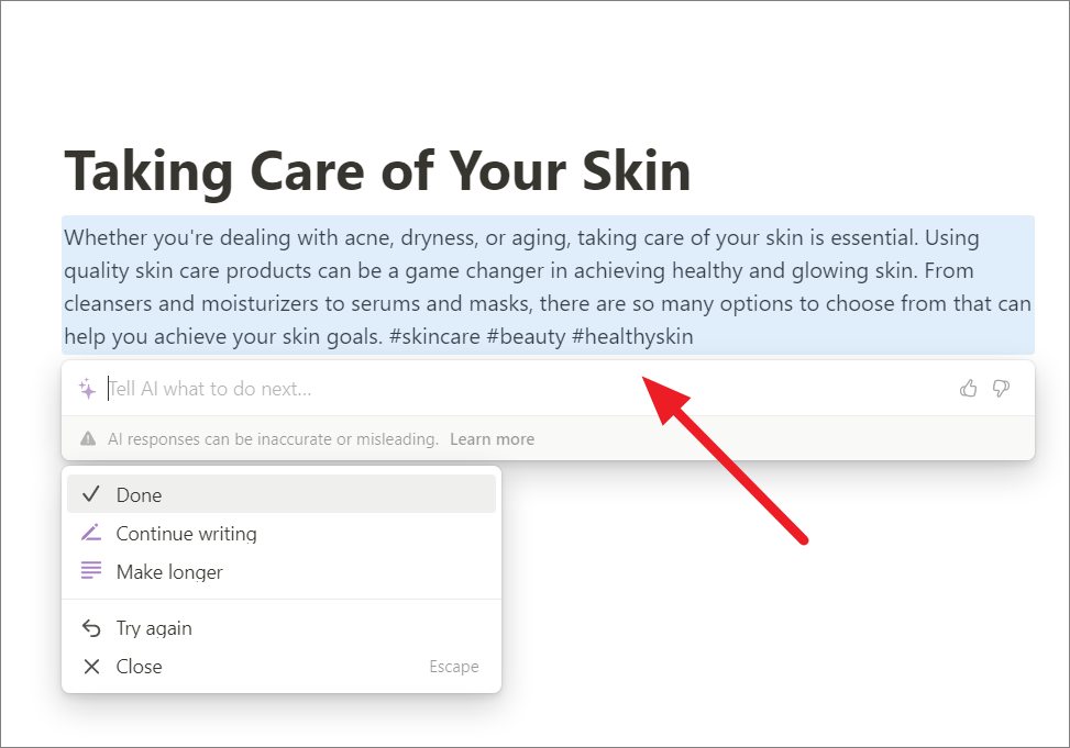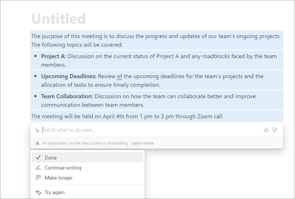 If you don’t like the response, you can click the ‘Try again’ option to get another response or you can ask the Notion AI for revisions until it gets it right.