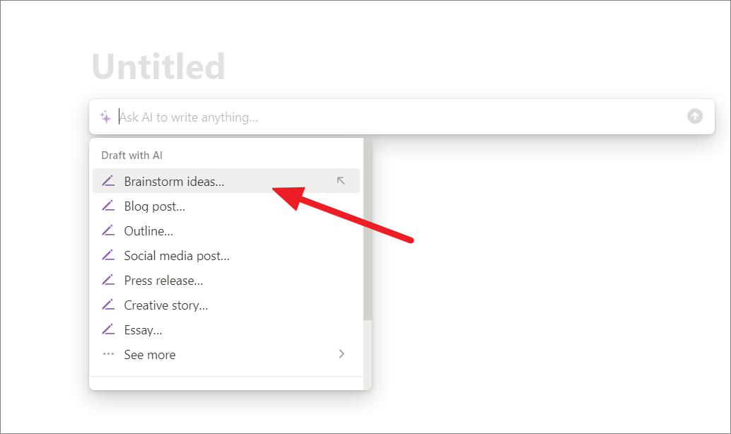 You can open Notion AI, go to the ‘Draft with AI’ section, and choose the ‘Brainstorm ideas’ feature.