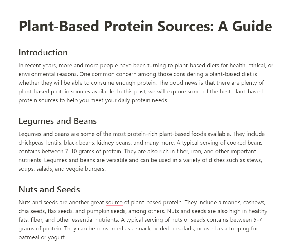 With this option, you can create a complete blog post in a minute. It even provides you with headings, subheadings, and bullet points based on your topic. All you need to do is provide a topic or an idea. For instance, I selected the ‘Blog post’ option and entered this prompt Write a blog post about plant-based protein sources.
