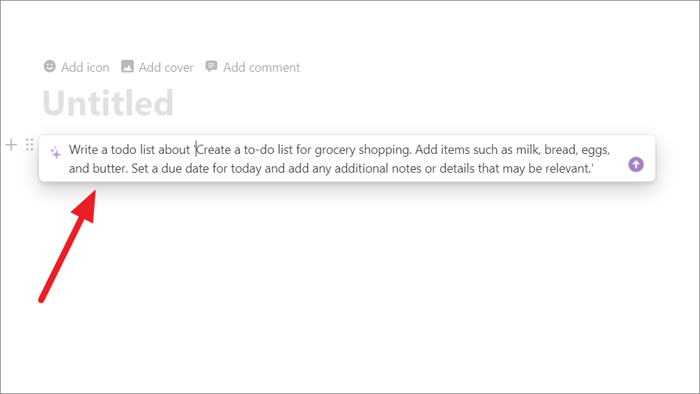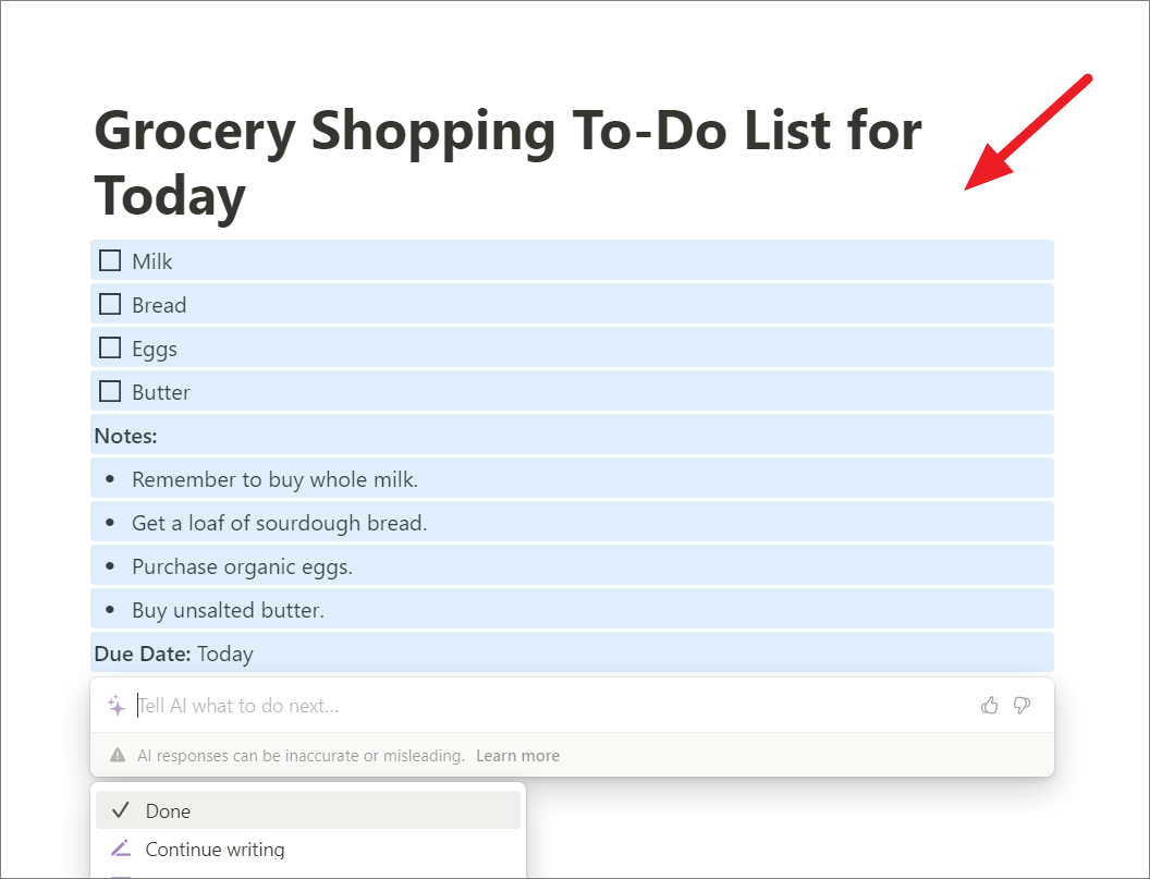 Here’s an example prompt to create a To-do list with Notion AI: Create a to-do list for grocery shopping. Add items such as milk, bread, eggs, and butter. Set a due date for today and add any additional notes or details that may be relevant.