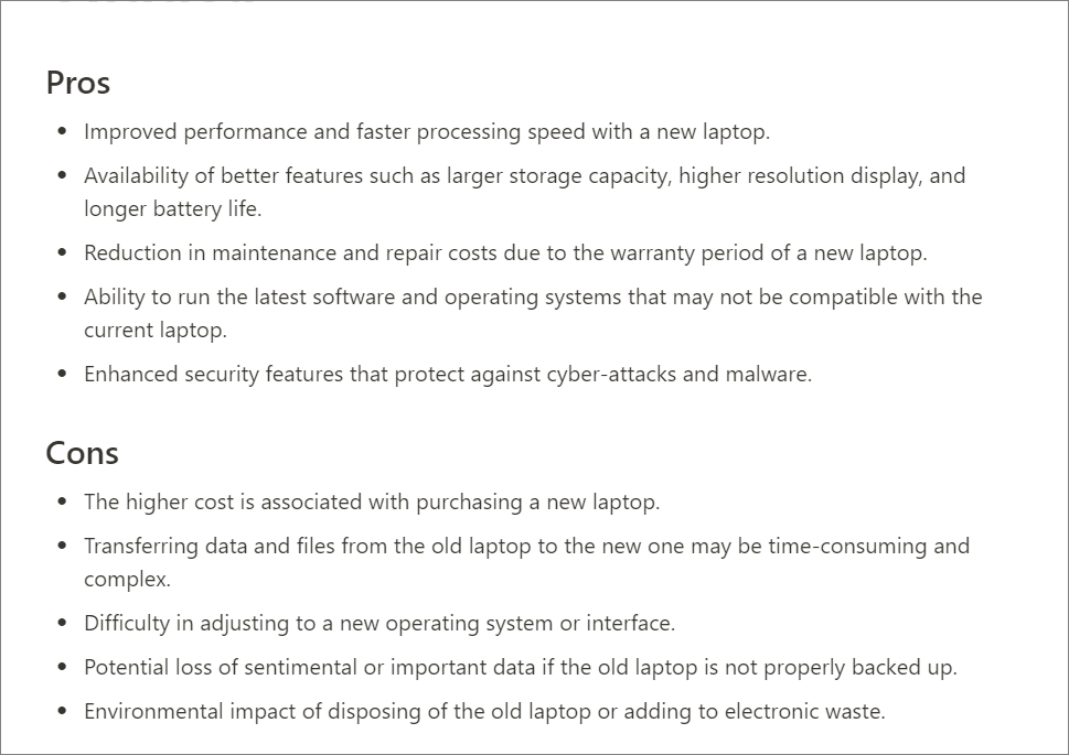 Here’s the list of pros and cons of buying a new laptop or keeping the old one generated by Notion AI.