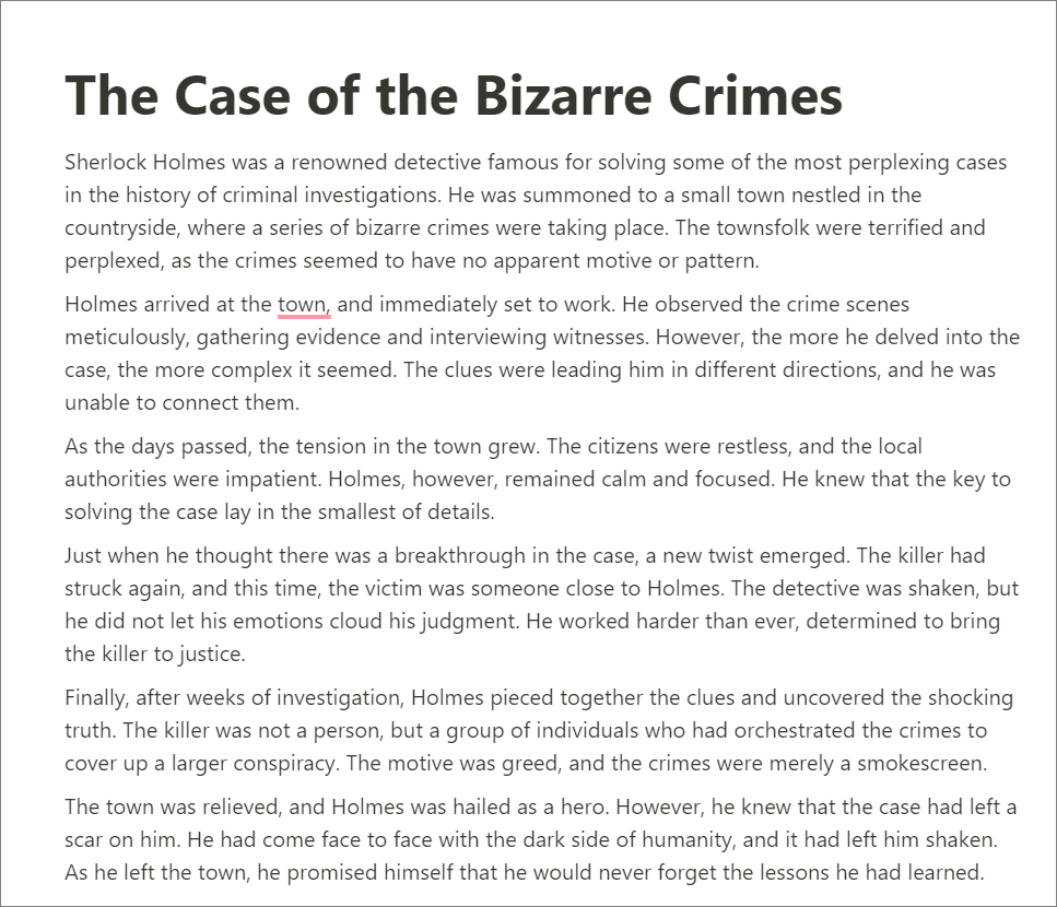 Write a creative story about a detective who is investigating a series of bizarre crimes in a small town. The detective's name should be Sherlock Holmes. The genre is a thriller and the tone is serious. Make sure to include plenty of plot twists and suspenseful moments that keep the reader guessing until the very end.