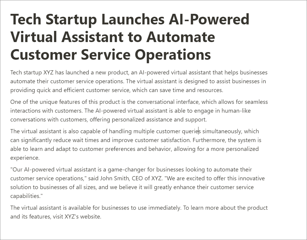 The AI wrote a really good press release. Since I didn’t provide the Startup name, the tool uses ‘XYZ’ as a placeholder name for the company. Even though I didn’t mention anything about quotes from the CEO or other company representative, the output includes sample quotes from a CEO.