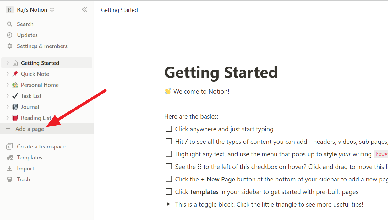 Once you are signed into your Notion account, open a new page. Click the ‘Add a page’ button on the left panel to create a new page.
