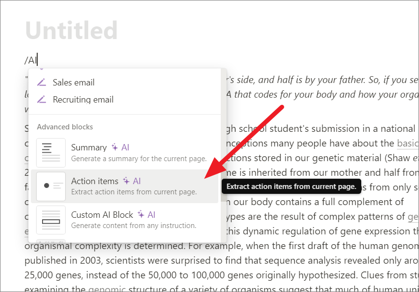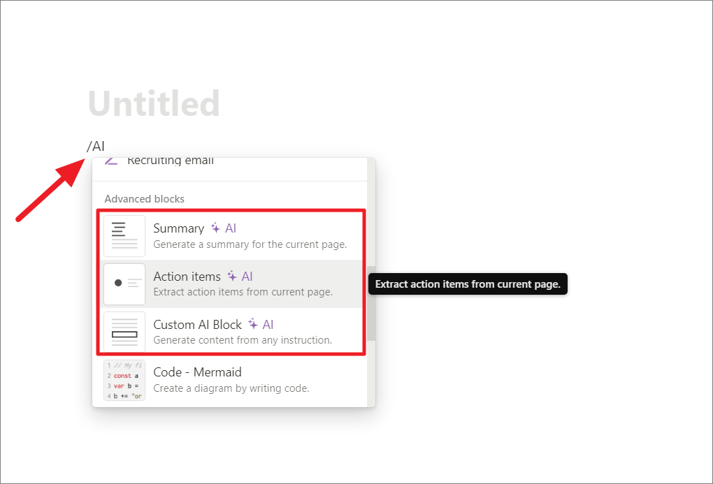 Type /AI and choose ‘Action items’ under the Advanced Blocks.
