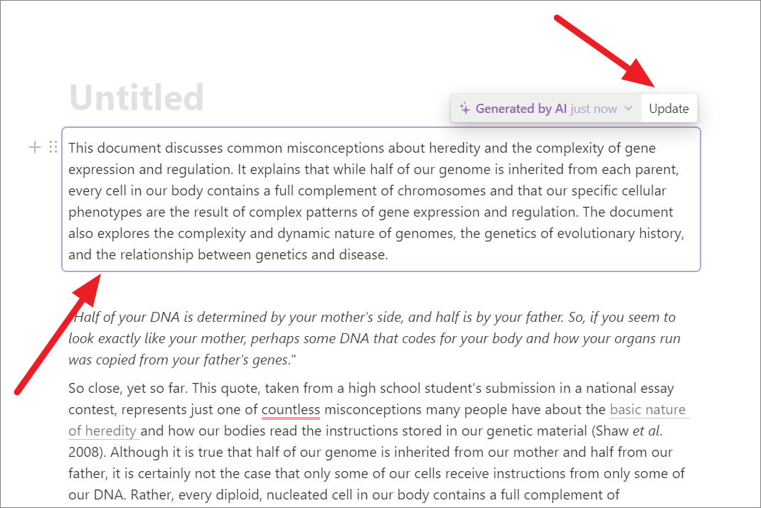 The AI block will use the AI feature to summarize the current page. If you add more content to the page, click on the Summary block and select ‘Update’ to update the summary.