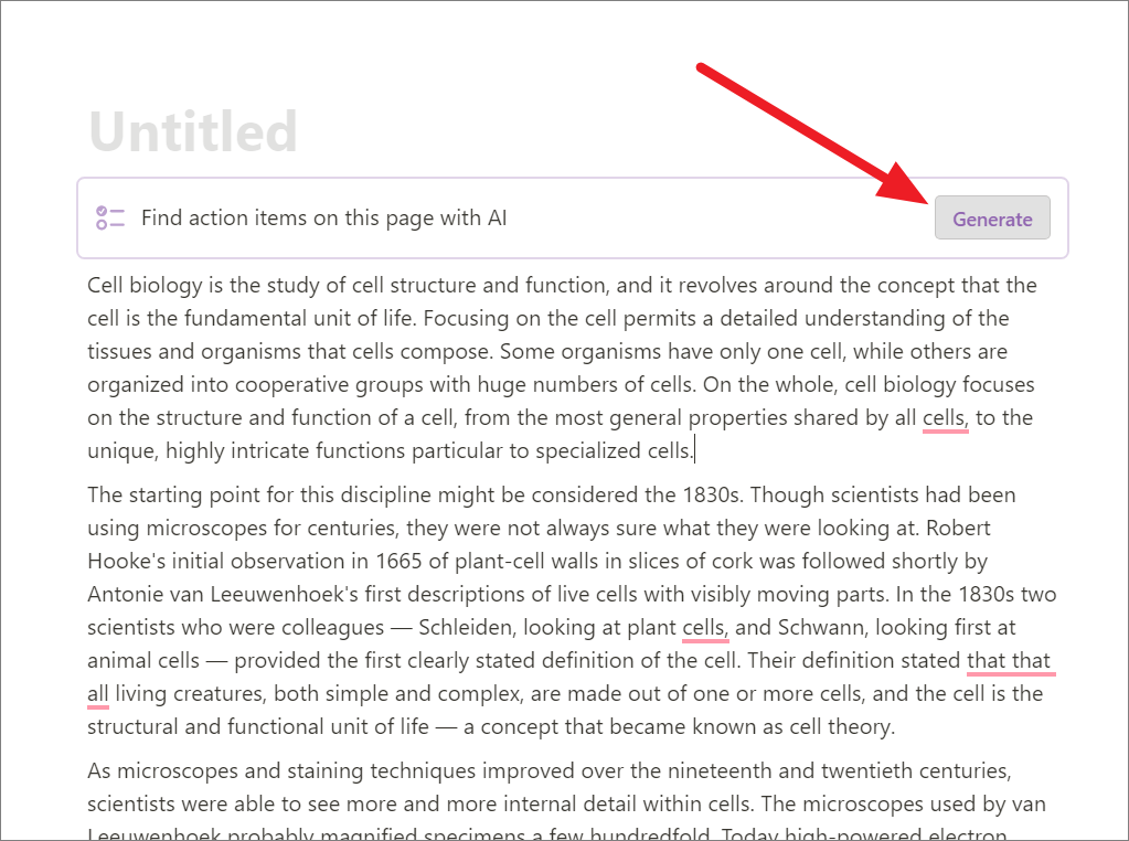 After writing your content, click the ‘Generate’ button on the Action items block to pull action items from the current page.