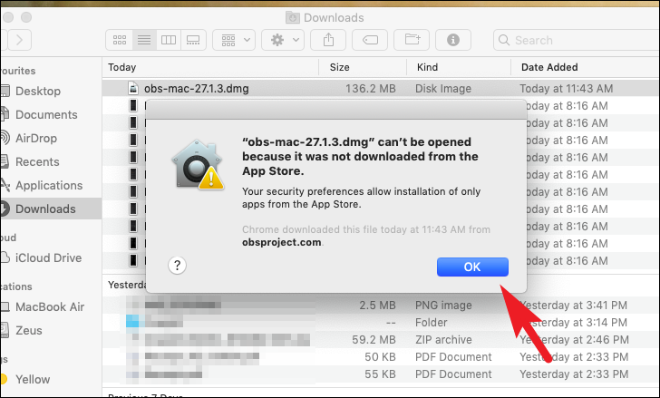 After that, you might receive a prompt saying the MacBook cannot install the app since it is not from a verified publisher. Click the ‘OK’ button present on the prompt to continue.