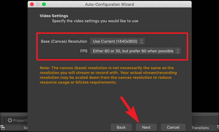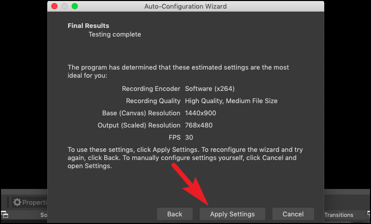 Once the test completes, OBS will display the determined ideal settings for your machine to record screen. Click on the ‘Apply Settings’ button to go ahead with the displayed settings. To configure them manually, click on the ‘Cancel’ button.
