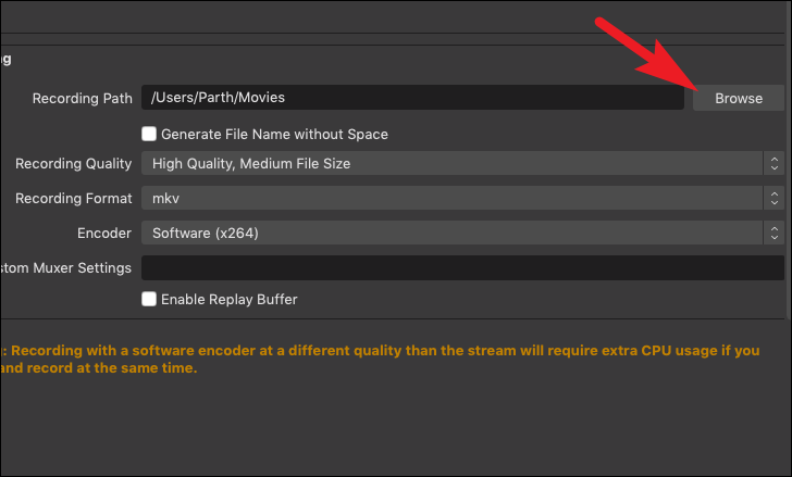 Then, from the right section of the window, locate the ‘Recording’ section, and click on the ‘Browse’ button following the ‘Recording Path’ option and select your desired directory using the Finder.