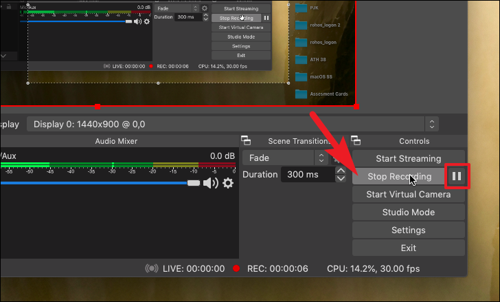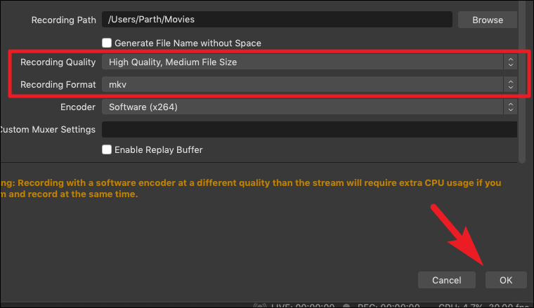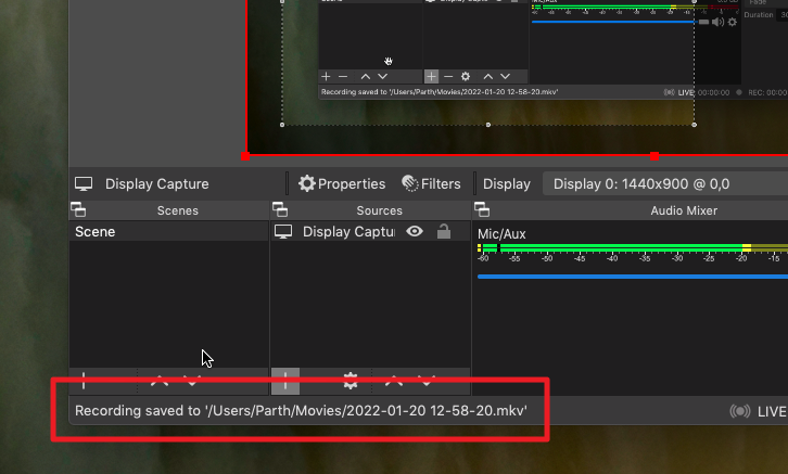 OBS will now display the complete path of the saved recording at the bottom left corner of the window. You can find the recording by heading to the directory using the Finder.