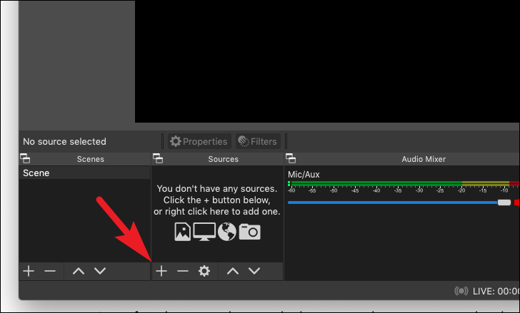Now on the OBS home screen, locate the ‘Sources’ section and click on the ‘+’ button. This will reveal an overflow menu.