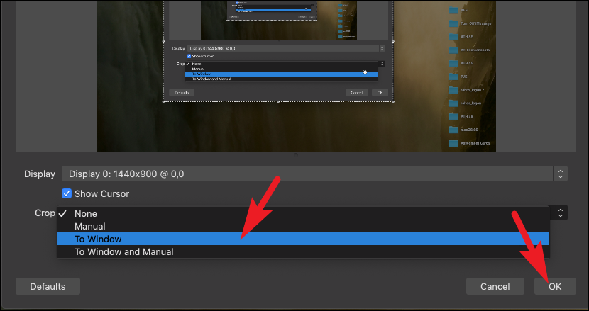 Moreover, if you wish to record only a single app window or crop the recording area, you can do that by clicking on the dropdown following the ‘Crop’ option. Then, select the ‘Manual’ option to set the recording area manually. Otherwise, click on the ‘To window’ option to select the app window on your computer to record. Once all is set to your preference, click on the ‘OK’ button to proceed.