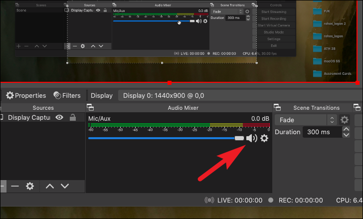 Now, OBS will capture sound from your mic by default. If you do not wish to record sound, locate the ‘Audio Mixer’ section and click on the ‘Volume’ button to disable recording sound for the video.