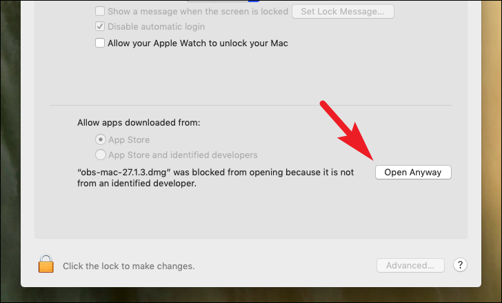 Next, click on the ‘Open Anyway’ button present at the bottom section of the System Preferences window. This will bring up a prompt on your screen.