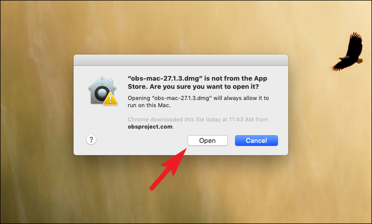 From the prompt, click on the ‘Open’ button to launch the installer for OBS Studio on your macOS device.