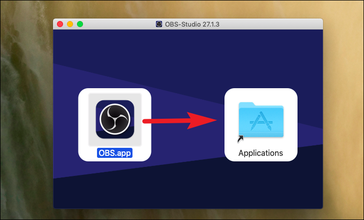 Now, from the installer window, click-hold and drag the OBS Studio app to the ‘Applications’ folder to install it on your MacBook.
