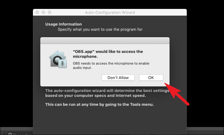 If this is your first launch of OBS studio, you will receive a prompt asking for permission to access the microphone. To grant permission, click on the ‘OK’ button.