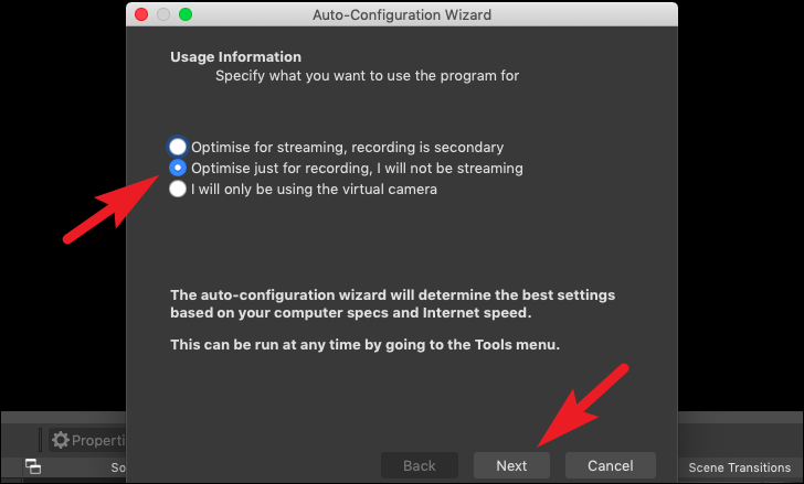 Next, you will be presented with an ‘Auto-Configuration Wizard’ on your screen. Click on the radio button preceding the ‘Optimise just for recording, I will be not streaming’ to optimize the OBS Studio for recording on your MacBook. Then, hit the ‘Next’ button present on the pane.