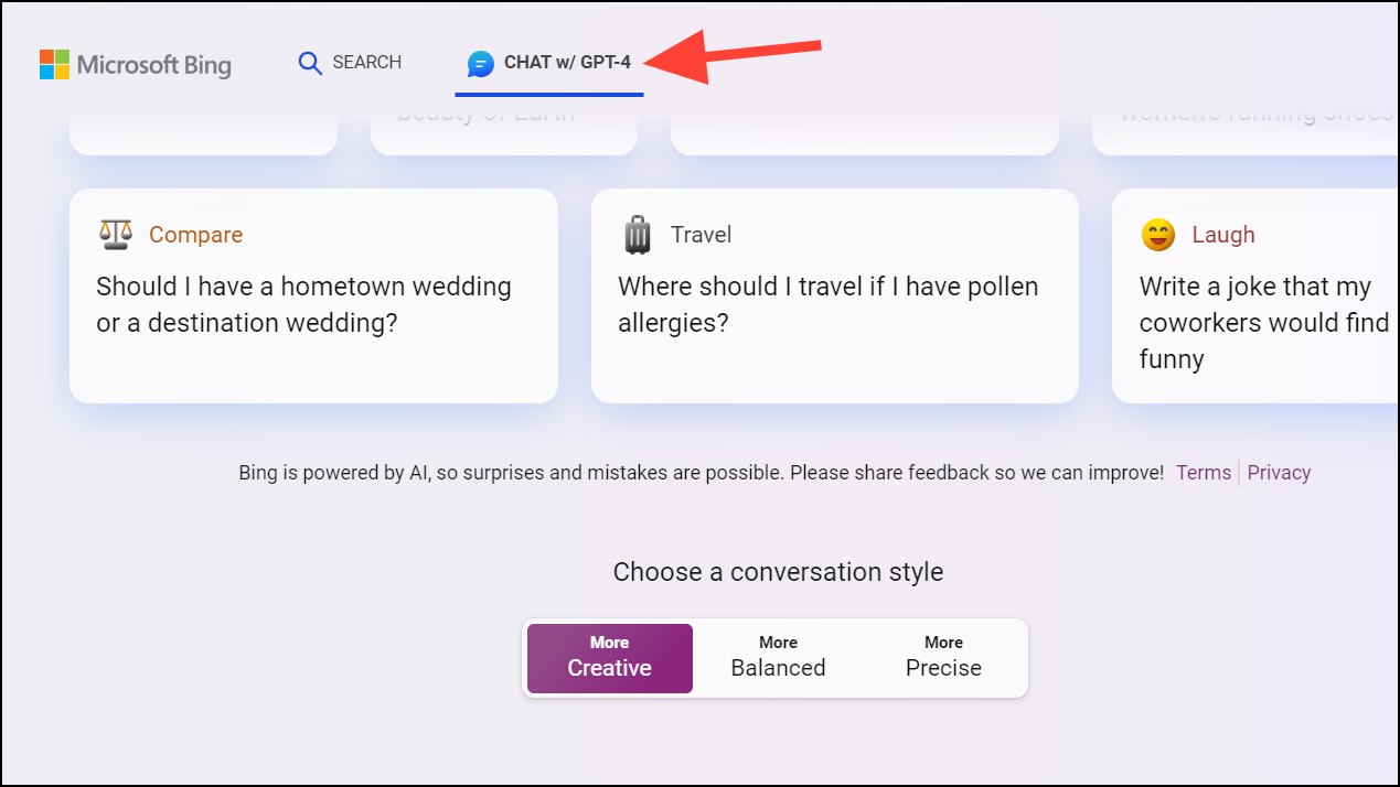 - Then, navigate to the Bing Chat interface by clicking on the 'Chat w/ GPT-4' tab from the Bing search engine page. You can also navigate to copilot.microsoft.com to access Bing AI.