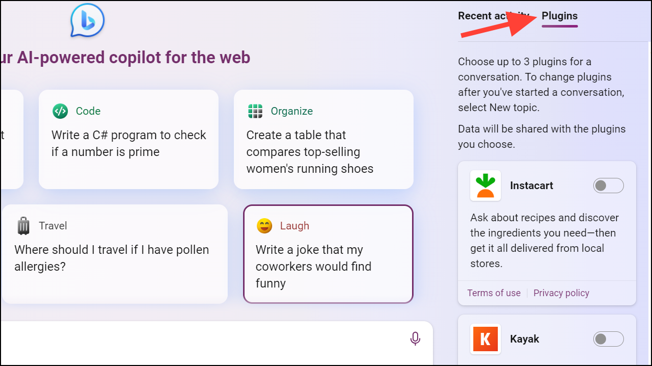 You can use up to 3 plugins in a conversation. Comparitively, there are very few plugins available in Bing Chat than in ChatGPT. However, you must remember that Plugins are third-party tools, and relevant data from your chats will be shared with these third-party developers.