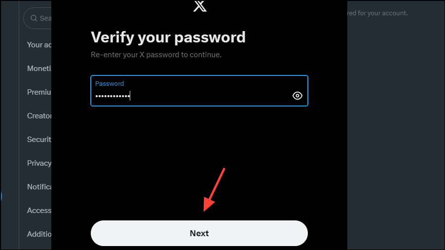 - You will need to verify your identity before you can download your data. To do so, enter your password and click on the 'Next' button.