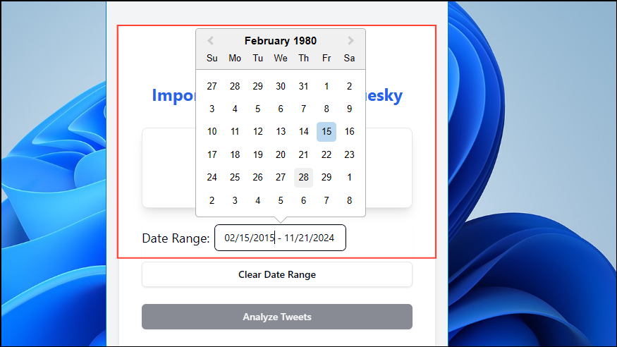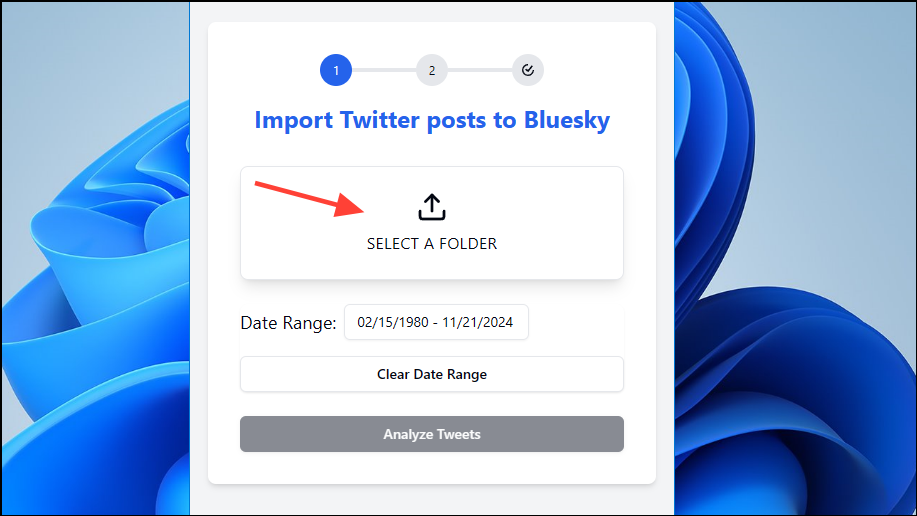 - Navigate to where you've downloaded your X data and select it to upload it. Then enter a date range for the period for which you want to move your X data to Bluesky.