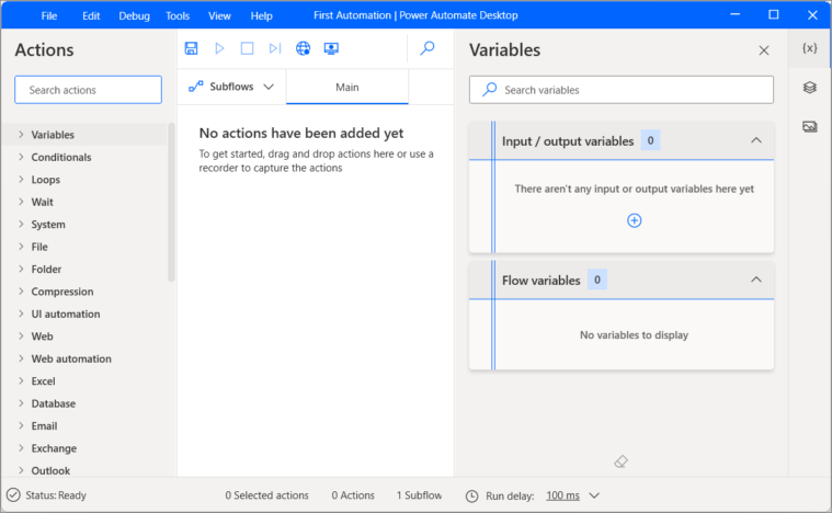 - The Actions pane on the left contains all the pre-built actions you can use.