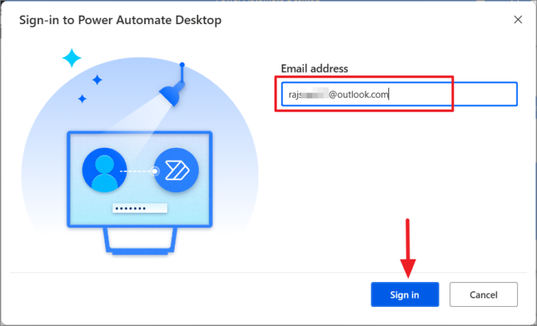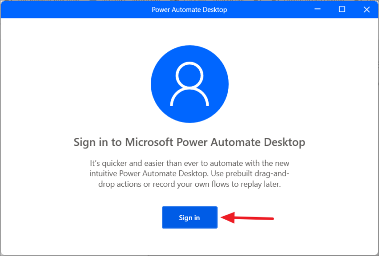After updating, the Power Automate Desktop window will prompt you to sign in with your Microsoft account. Click on the Sign in button to proceed.