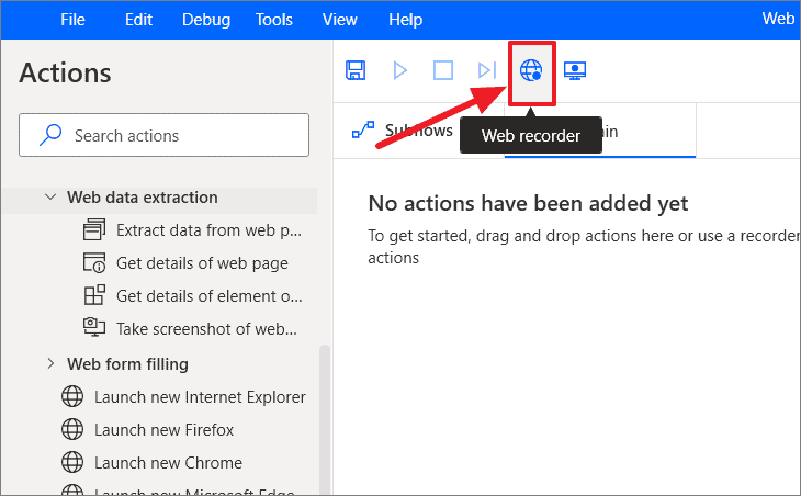 - In the flow editor, click on the Web recorder button.